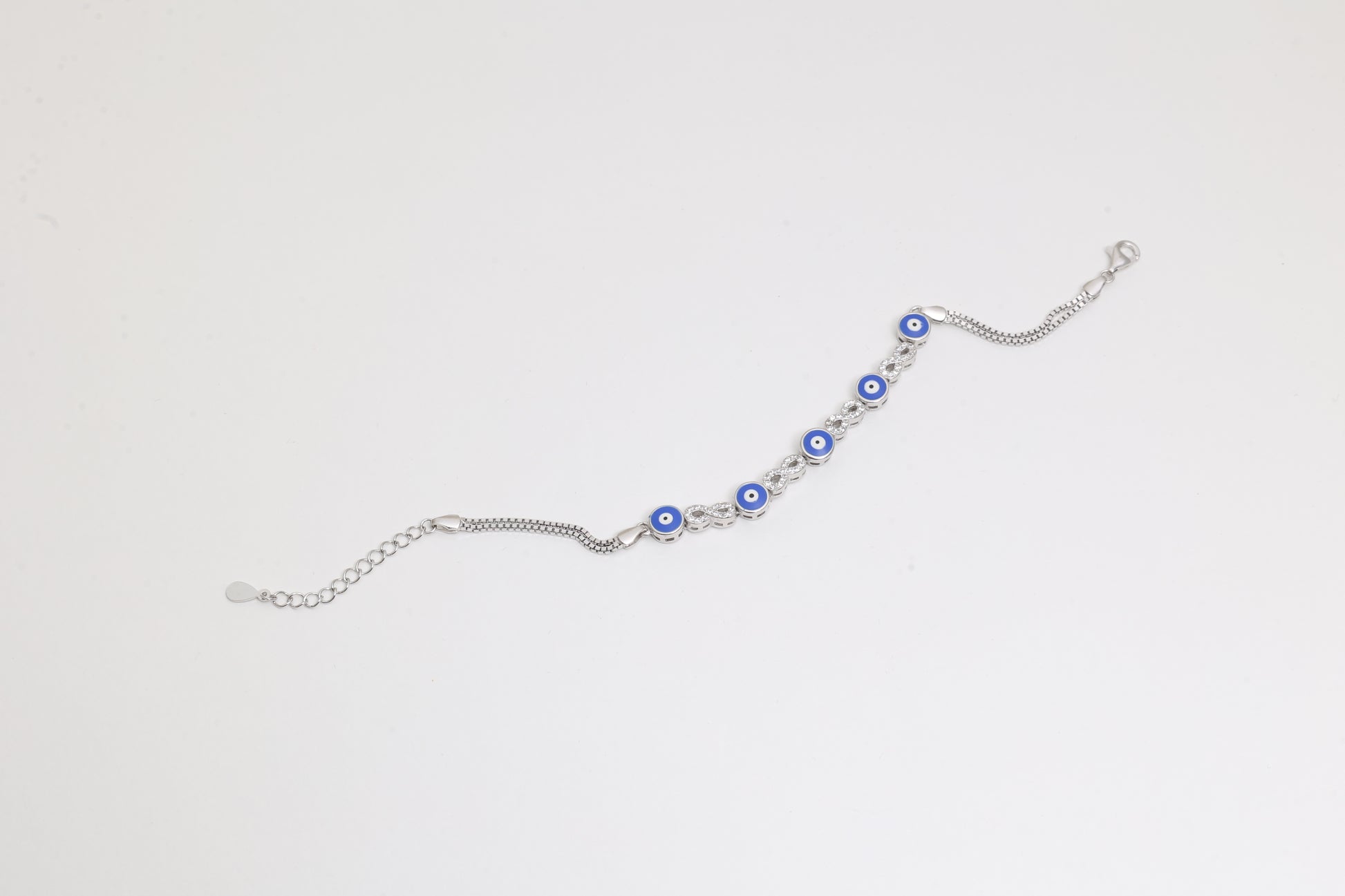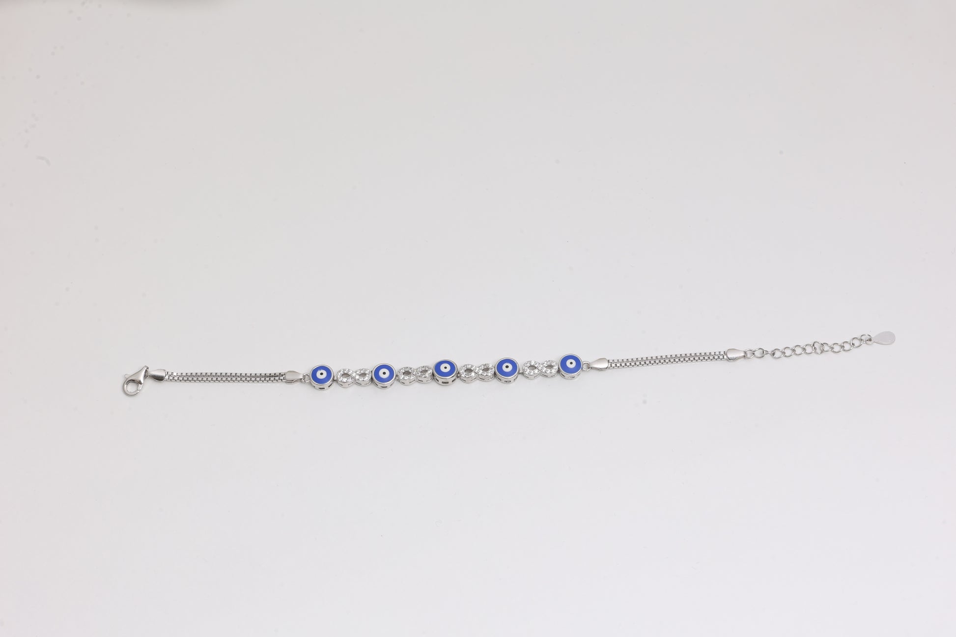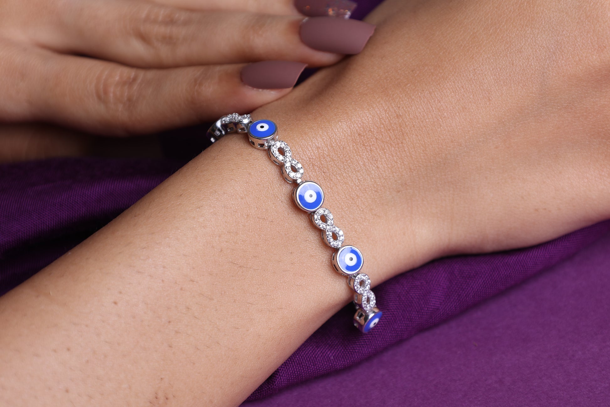 A protective charm bracelet featuring alternating evil eye and infinity motifs, blending spiritual symbolism with sparkling modern elegance.