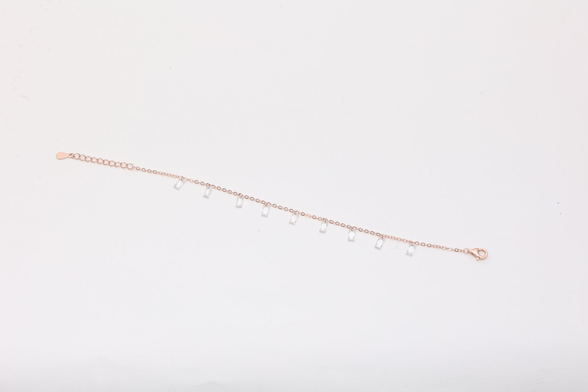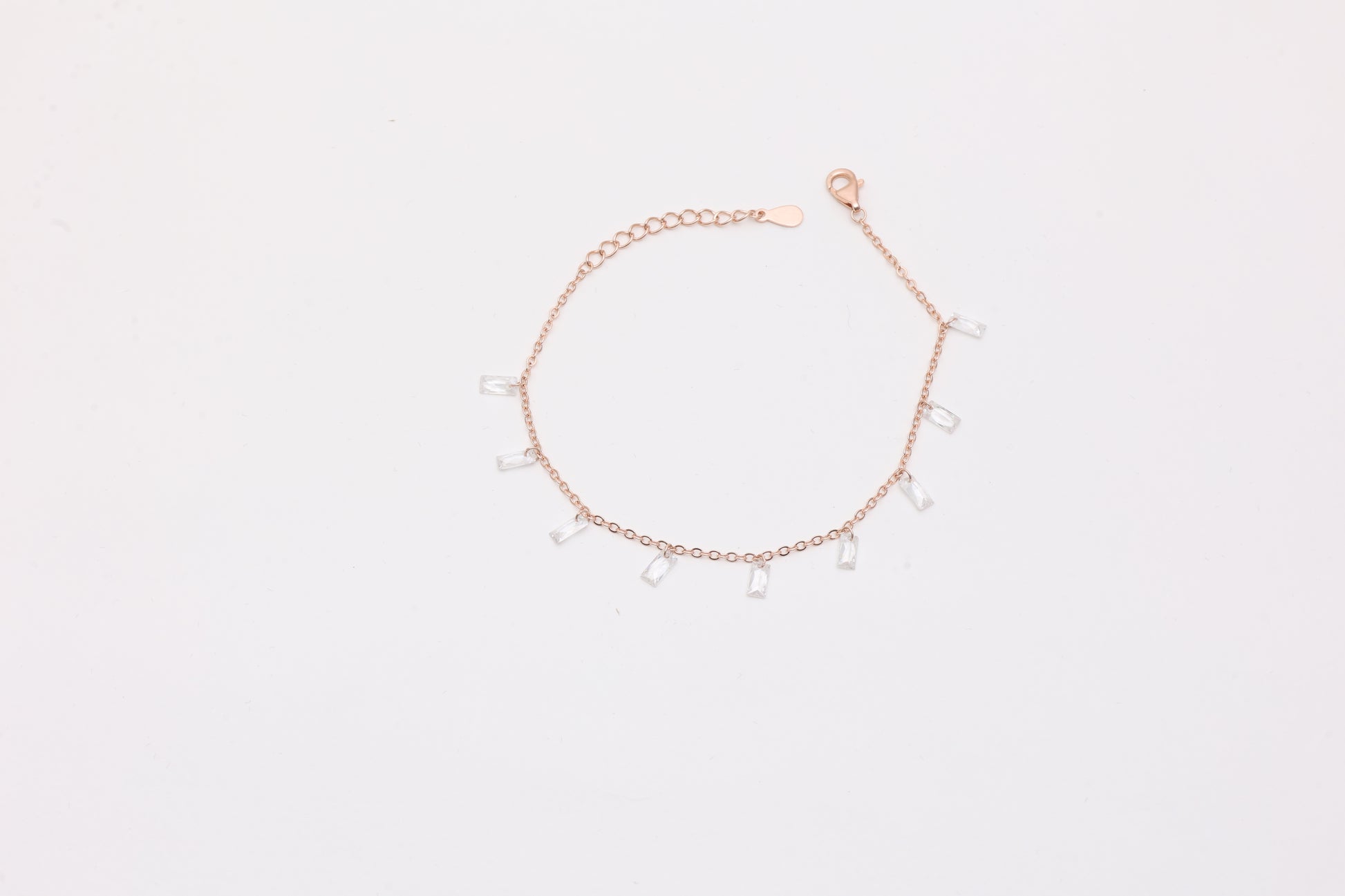 Bring playful sparkle to your everyday look with this delicate dangling baguette charm bracelet. Each stone sways gracefully with movement, catching the light from every angle. Perfect for layering or wearing solo, its a must-have statement of chic minimalism.