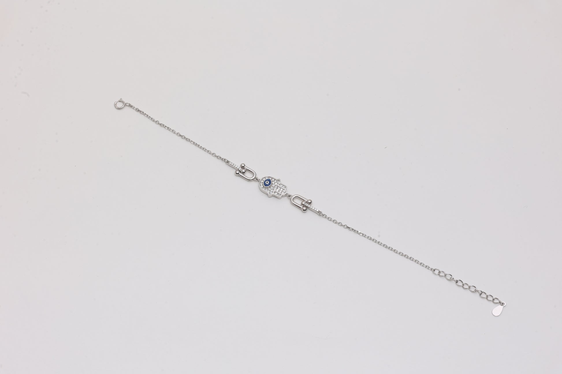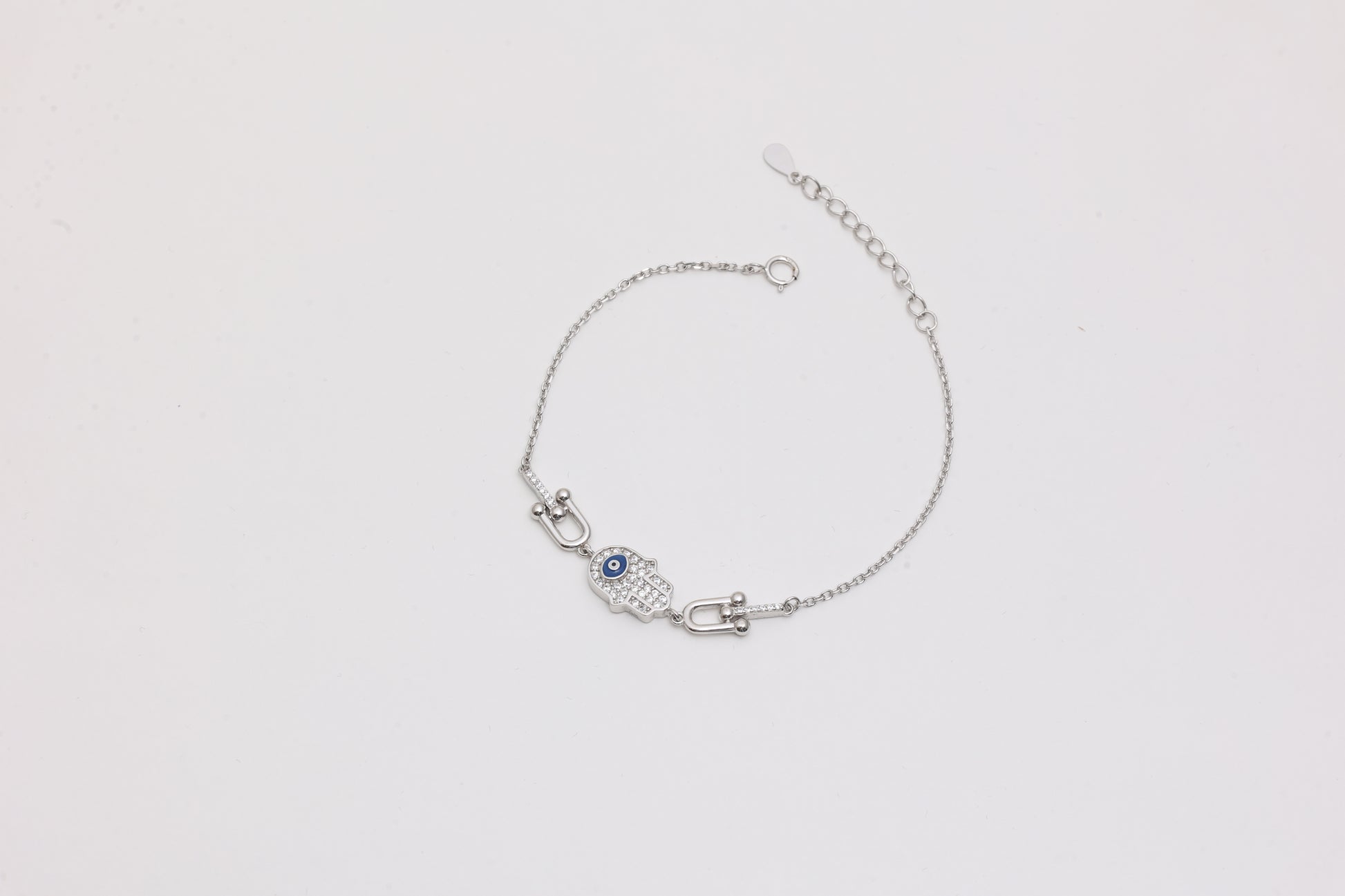 - Hamsa hand charm with pavé setting and evil eye center