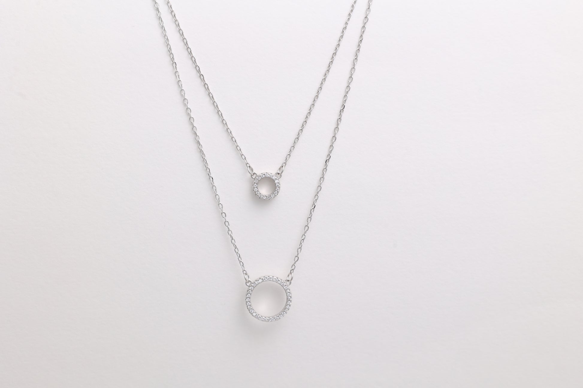 A modern symbol of harmony, this layered necklace showcases twin open circles, delicately encrusted with cubic zirconia for effortless sparkle. Available in white gold and rose gold finishes, its a versatile piece that elevates both everyday outfits and evening ensembles.