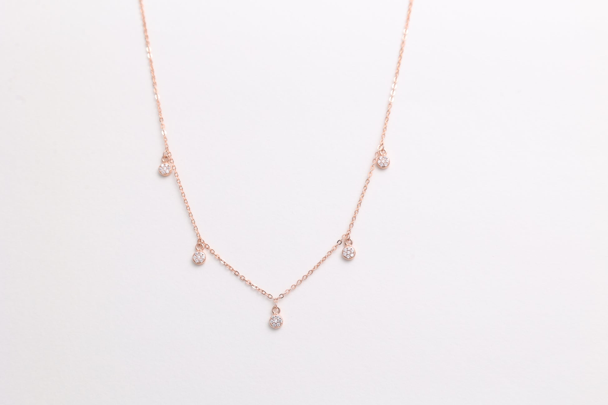 Delicate and feminine, this necklace features five sparkling drop charms that catch the light with every movement. Its lightweight construction makes it an effortless layer or a subtle stand-alone statement.