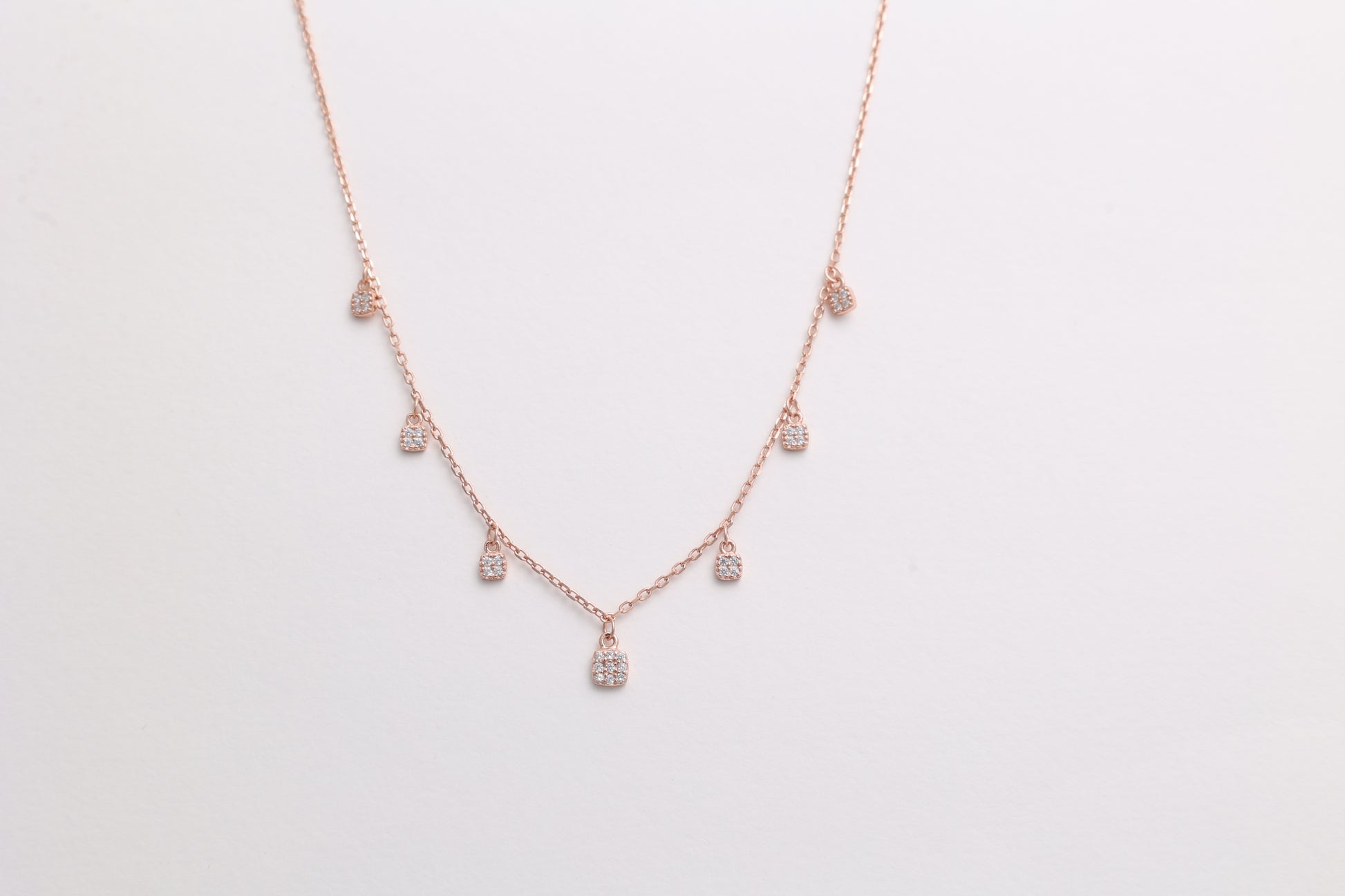 A timeless design featuring cushion-shaped zircon drops that shimmer with every step. Available in white gold and rose gold plating, this piece adds classic sparkle to your everyday style.