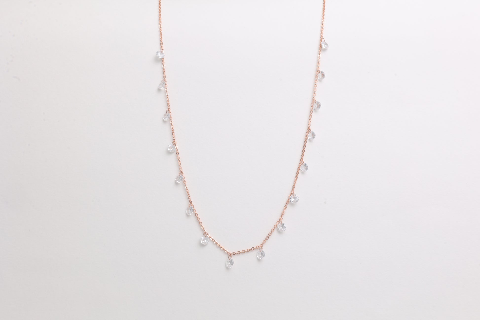 A modern take on everyday jewelry, this necklace features dainty round CZ charms stationed delicately along the chain. Minimalist and chic, it transitions effortlessly from casual to evening looks.