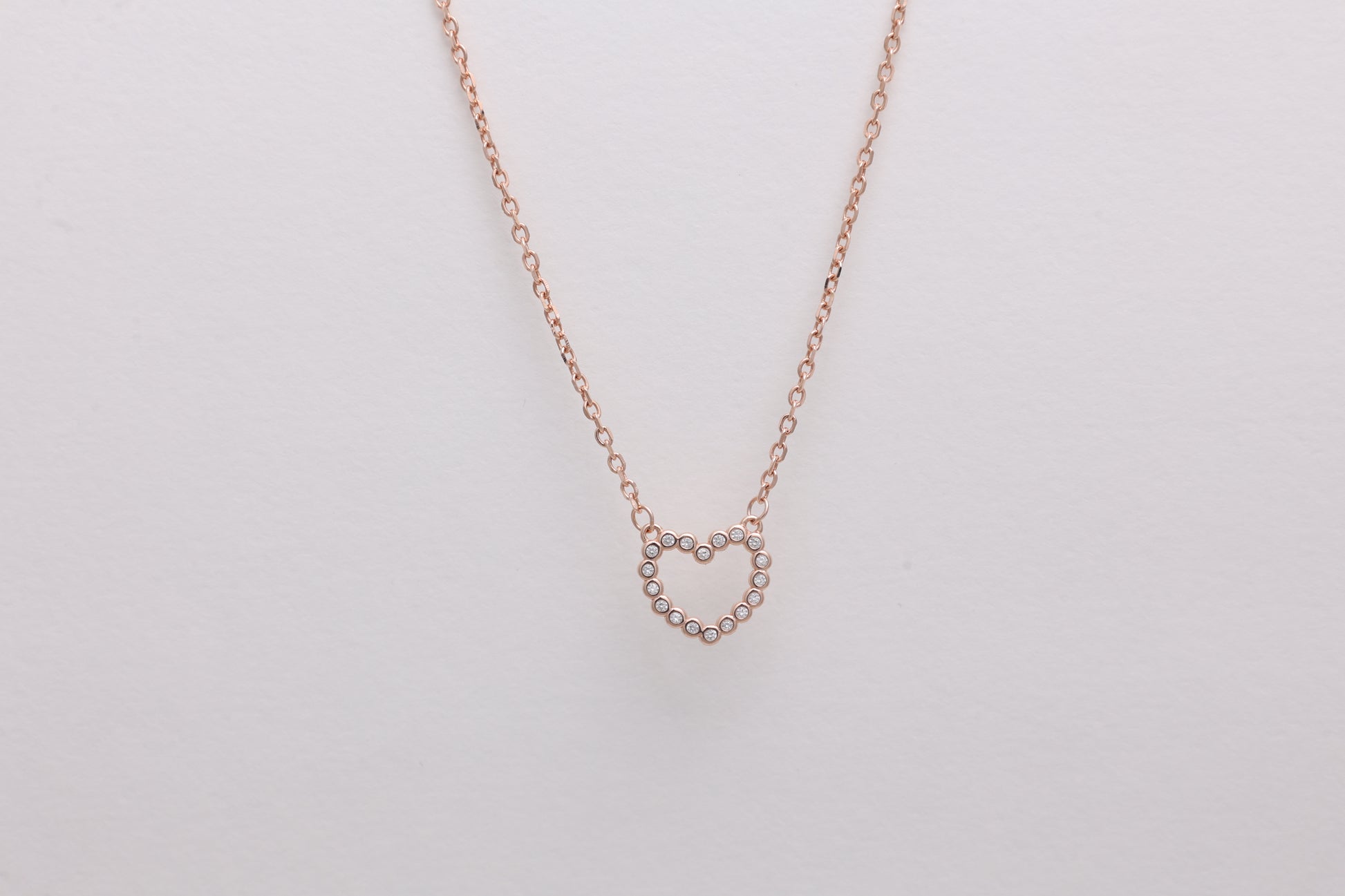 A romantic open-heart pendant encrusted with cubic zirconia, suspended on a rose gold plated chain. The delicate sparkle makes this piece an ideal gift of love and affection.